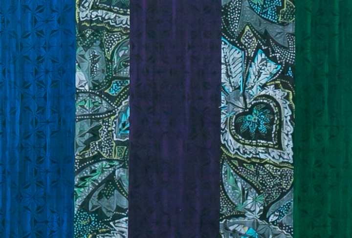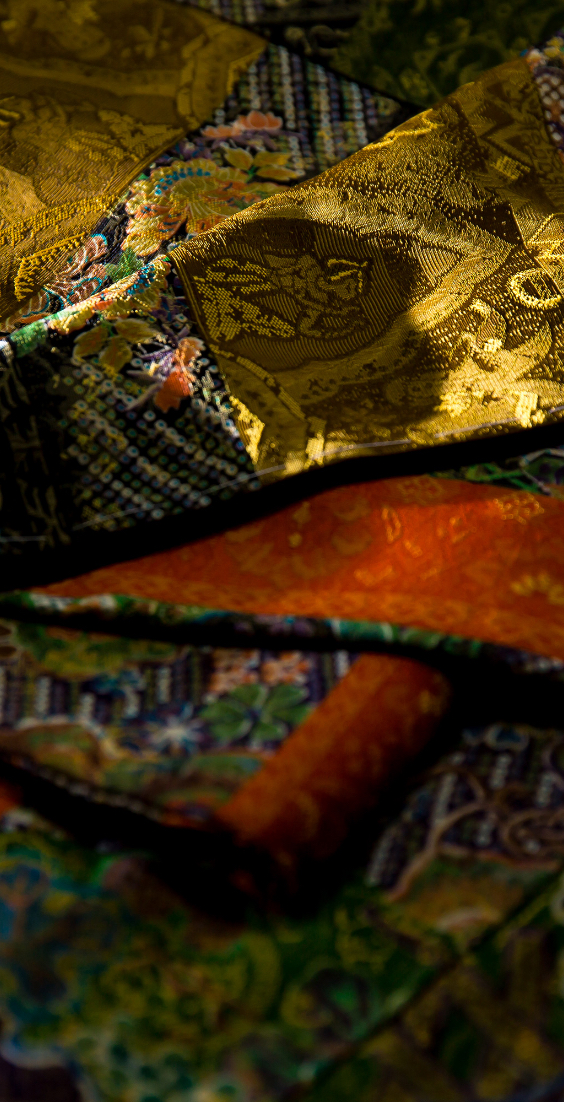 まるで一枚の布を羽織るような感覚の更紗は、洋服やドレスの着こなしです。そして、個性的な帯合わせ。